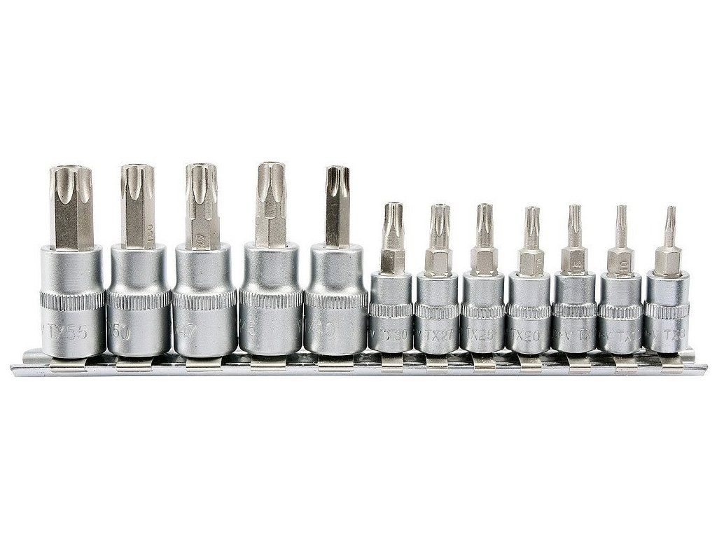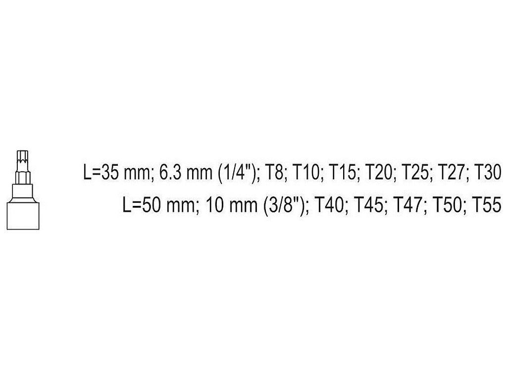 Délky bitů 37 a 48 mm, určené pro 1/4" a 3/8" ráčny. V sadě je kovový držák bitů a samotné bity T8-T55. Splňuje normu DIN 3120 pro vysoce-zatěžovatelné nástavce.