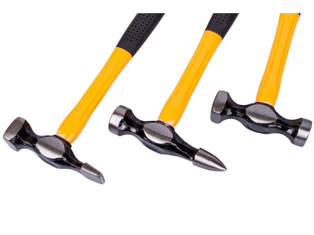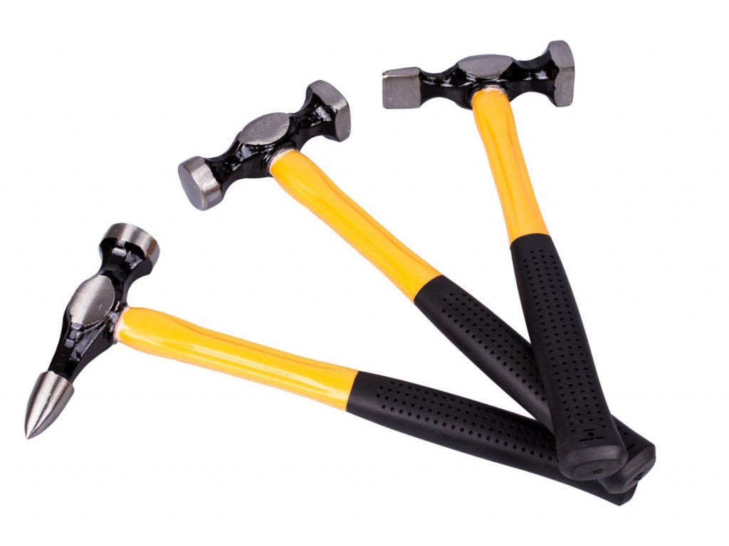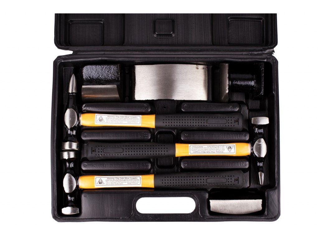 Celkem 3 karosářské vyklepávací kladiva o délce 283 mm mají sklolaminátové topůrko s děrovanou rukojetí pro neklouzavý úchop. Kladiva i 4 příložné babky různých rozměrů a tvarů mají broušené pracovní plochy.