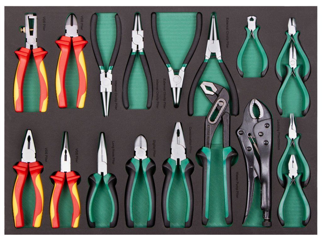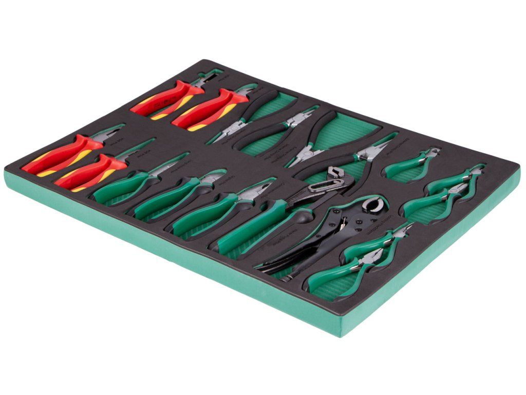 Rozsáhlá sada standardních, mini i VDE kleští pro široké spektrum mechanických, montážních a elektrotechnických prací – přehledně uložená v pěnové výplni pro dílenské vozíky.