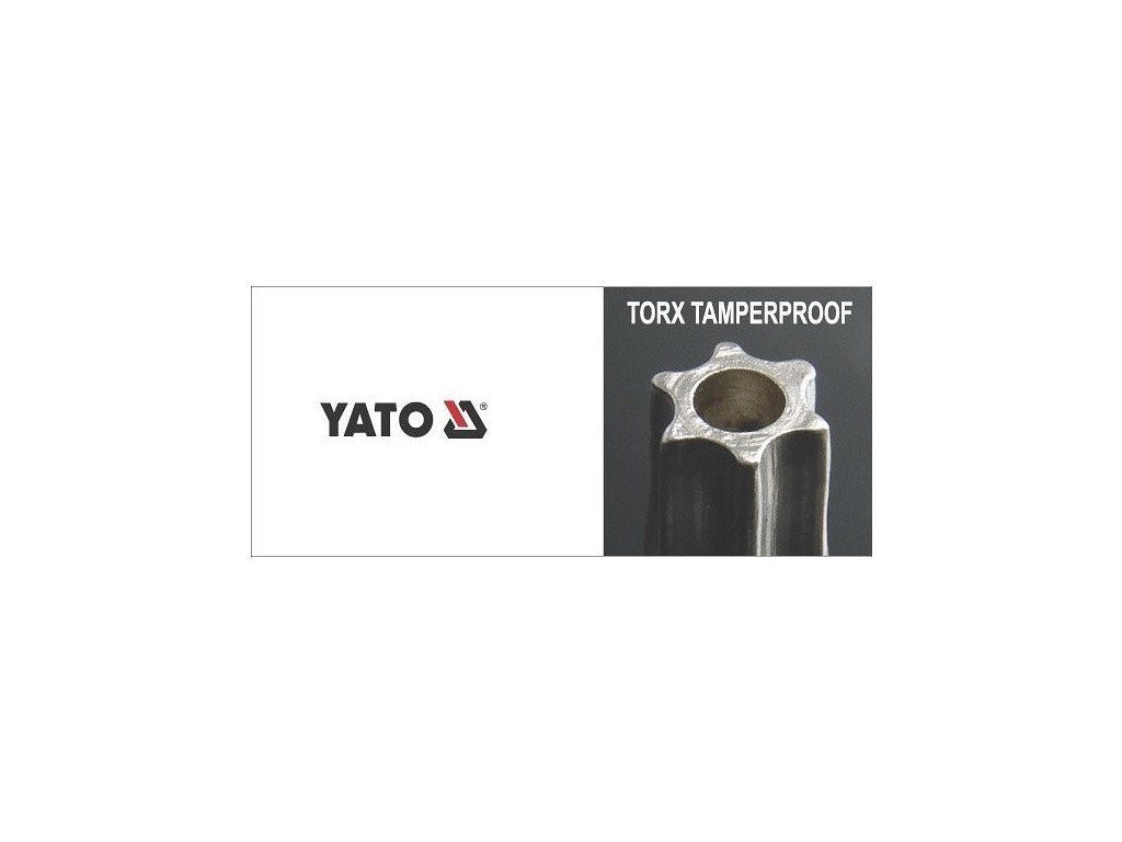 Klíče Torx Yato zahnuté s otvorem na krátkém i dlouhém rameni, vyrobemé z chromvanadiové slitiny oceli CrV6150, tvrzené na tvrdost HRC52-55. Sada obsahuje 9 kusů klíčů T10- T50. Otvor ve středu klíče umožňuje i montáž tzv. bezpečnostních šroubou Torx (Torx - Tamperproof).