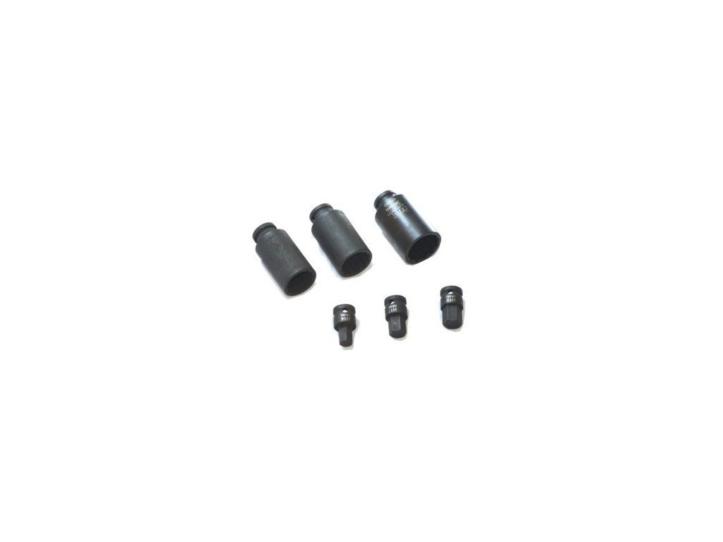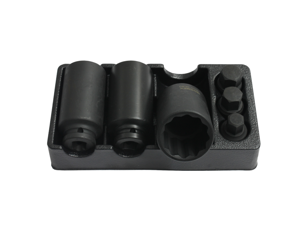 Sada nástavců na poloosy obsahuje vnitřní tisícihranné nástrčné klíče 1/2" (dvanáctihranné/dvojitý šestihranné) v dlouhém provedení o délce 85 mm ve velikostech 30, 32 a 36 mm. V sadě naleznete také krátké vnější nástrčné klíče HEX 1/2" o délce 43 mm ve velikostech H14, H17 a H19. Všechny hlavice jsou v provedení pro rázové utahováky (kované).