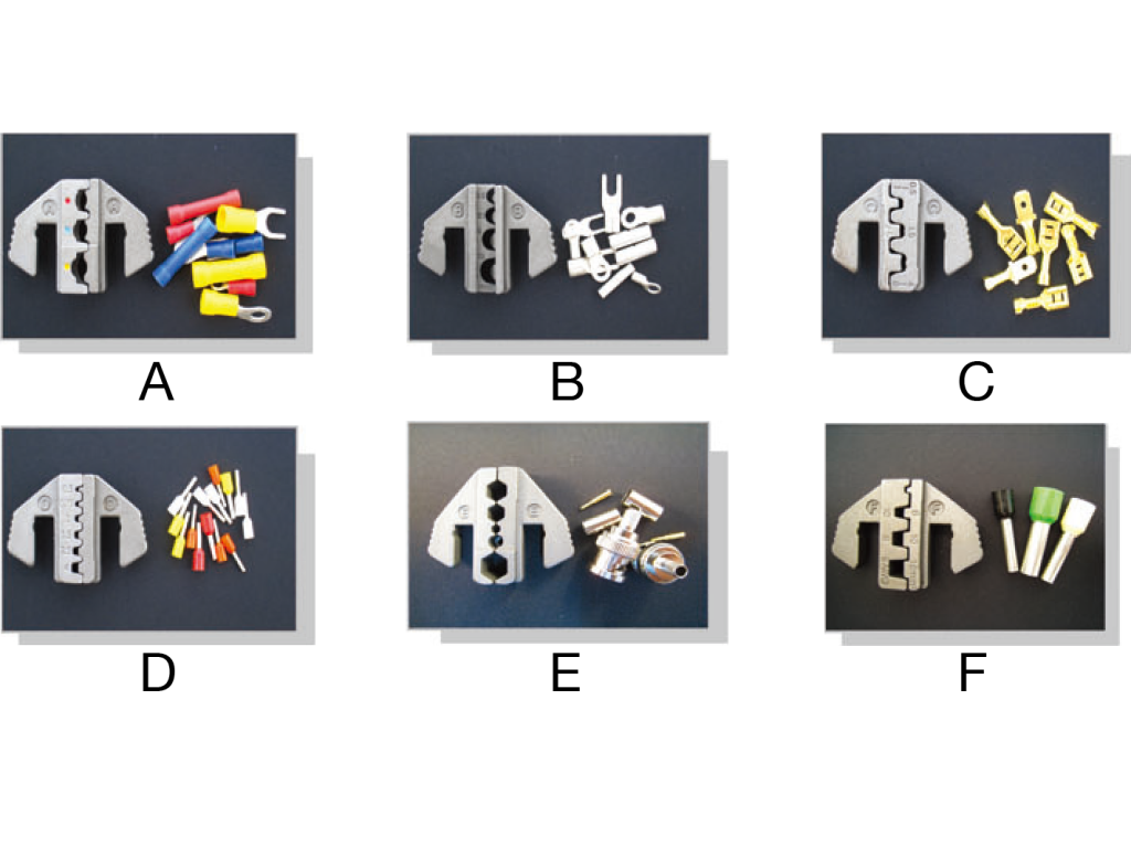 Krimpovací kleště obsahují 6 ks vyměnitelných adaptérů pro různé druhy koncovek (viz. foto).
