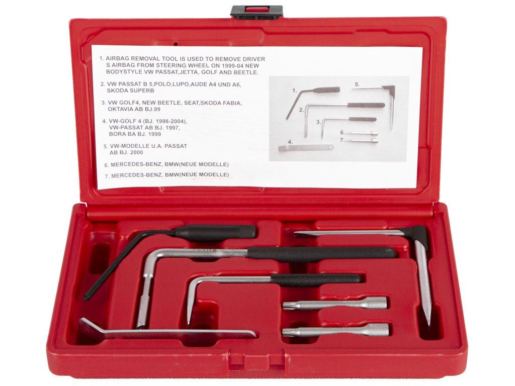 Kompletní sada pro rychlou a bezpečnou demontáž airbagů. Je vhodná pro většinu evropských vozidel, a díky kvalitnímu provedení zaručuje spolehlivé a dlouhodobé použití. Sada obsahuje všechny potřebné nástroje k odstranění airbagů z volantů, což usnadňuje jejich výměnu nebo opravy bezpečnostních systémů.