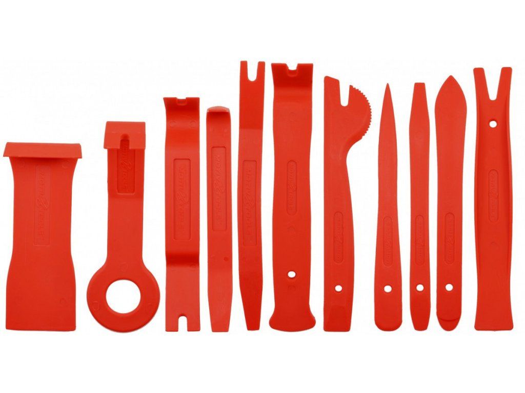 Sada obsahuje 11 nástrojů se speciálním profilem na demontáž vnitřních a vnějších příchytek plastových a čalouněných částí automobilů zajišťují bezpečnou práci a velkou úsporu času. Materiál v kombinaci s profilem nástrojů je navržený tak, aby nedošlo k poškození laku vozu, čalounění a pochromování. Pro dlouhou životnost jsou přípravky sady na demontáž čalounění vyrobeny z pružného plastu s nylonovým vláknem, které je silnější a odolnější, než ABS plast.