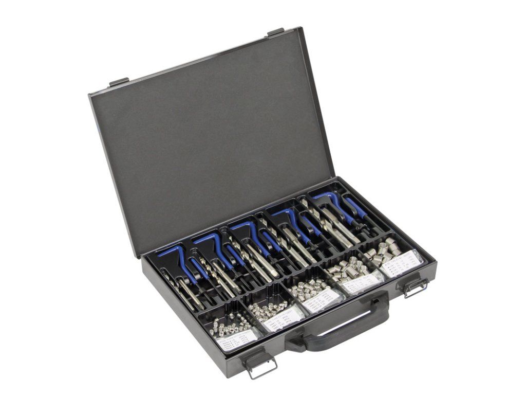 - 110 ks opravných vložek: 25 ks M5 × 0,8 mm / 25 ks M6 × 1 mm / 25 ks M8 × 1,25 mm / 25 ks M10 × 1,5 mm / 10 ks M12 × 1,75 mm