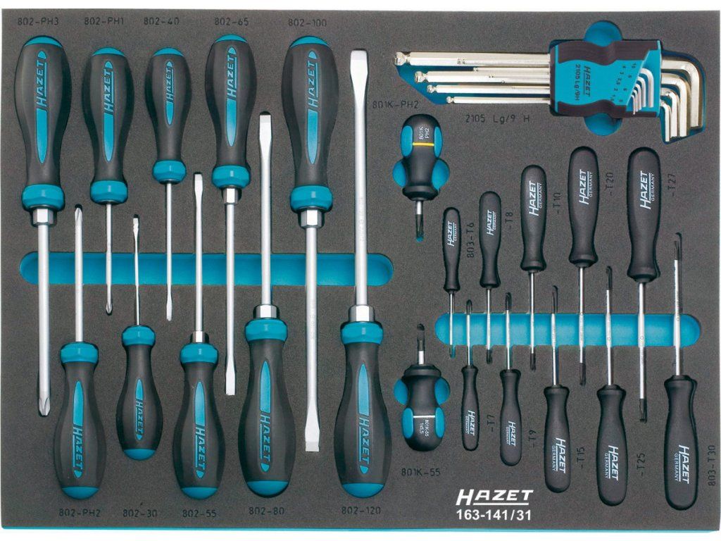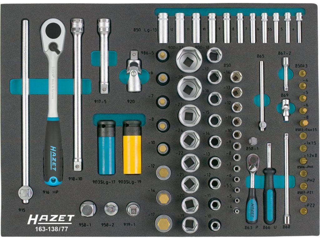 Sada nářadí kvalitní německé značky Hazet ve vložkách z měkké pěny Safety Insert System, což je pěnová vložka, v které je veškeré nářadí bezpečně ukotveno. Veškeré nářadí je omyvatelné pod tekoucí vodou.