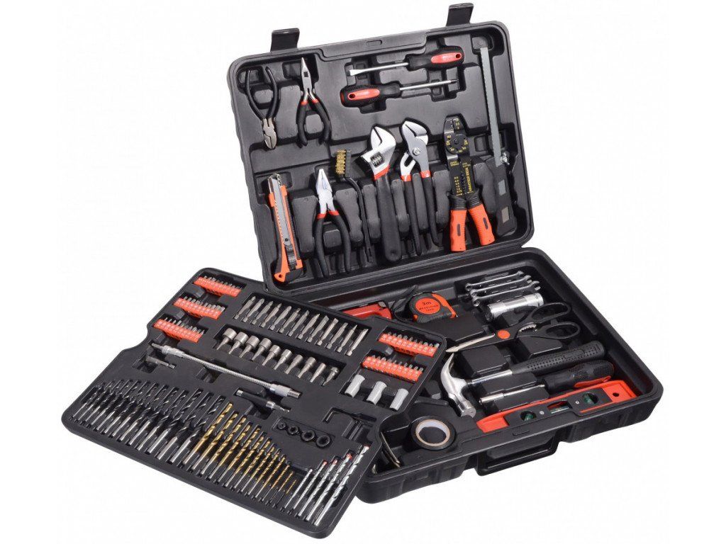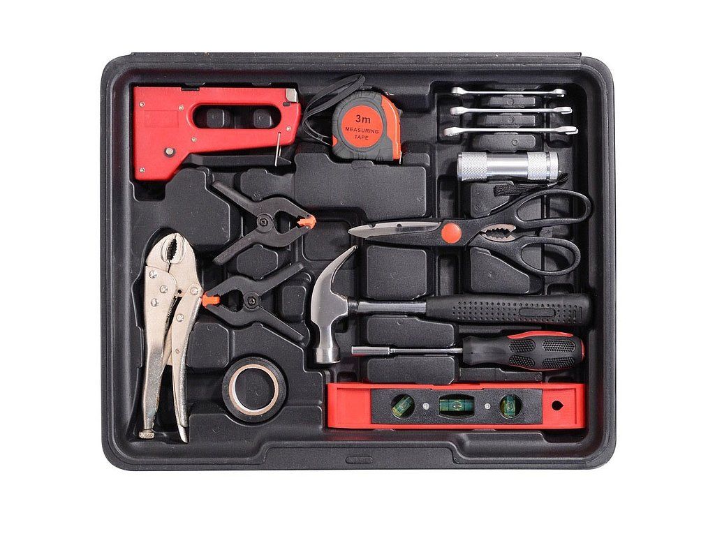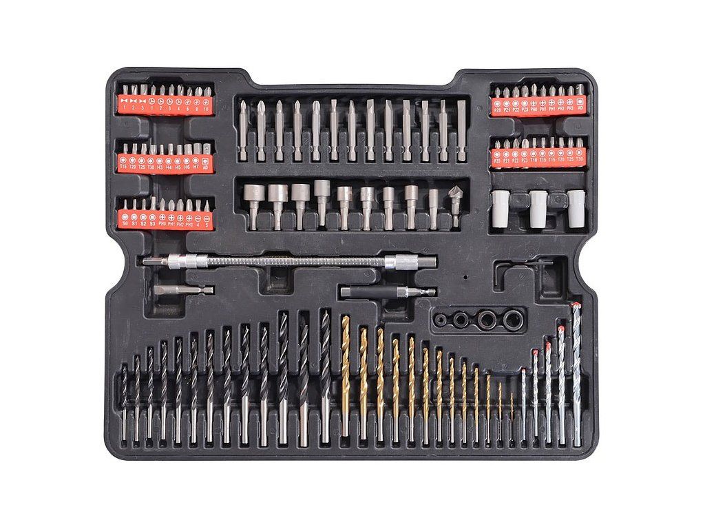 Sada obsahuje celou řadu vrtáků, bitů, nástrčných klíčů, šroubováky, kleště, kladivo, vodováhu, stranové klíče, základní spojovací materiál a celou řadu dalšího nářadí, které je vhodné pro použití jak doma, v garáži, tak i na cestách.