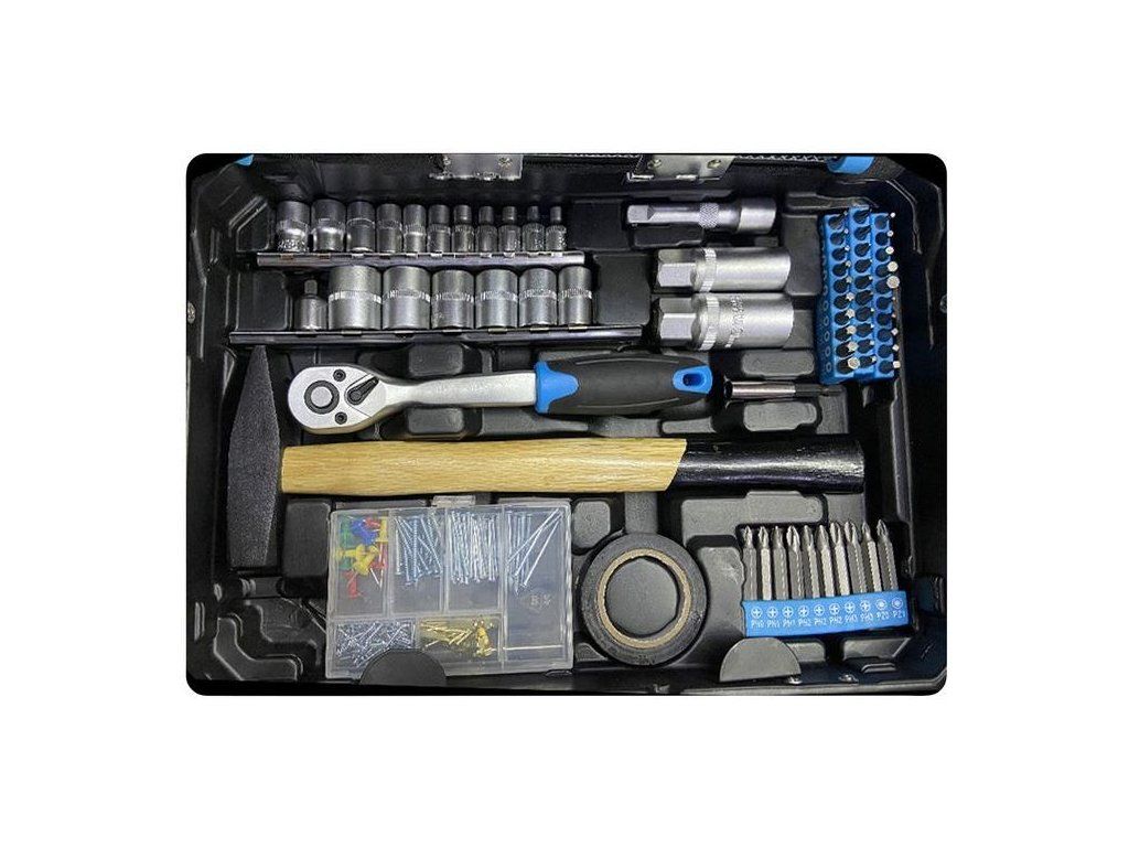 241dílná souprava z chrom-vanadové (uhlíkové) oceli, sestávající z nejrůznějších druhů nářadí: od šroubováků přes ráčnu, rozličné nástrčné i očko-ploché klíče, kleště ap. až po pilu a široký výběr bitů (vč. dlouhých). Chybět nemůže ani vodováha, metr a kladivo. Kufřík dále obsahuje krabičku s roztříděným spojovacím materiálem - hřebíky a šrouby. Tento všestranný pomocník je opravdu dobrou volbou, ať už si jej pořídíte pro práce ve vlastním bytě nebo jako výbavu pro osamostatňující se potomky.