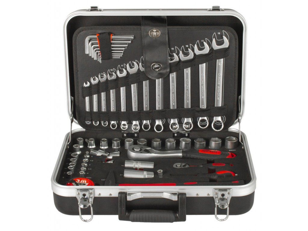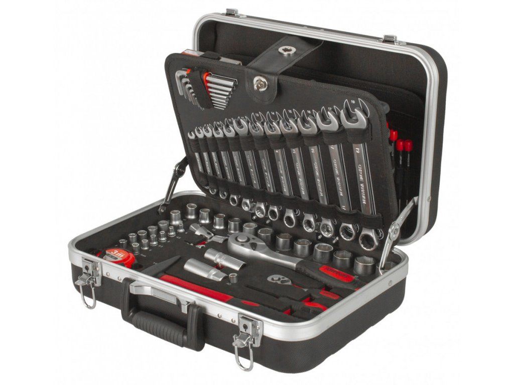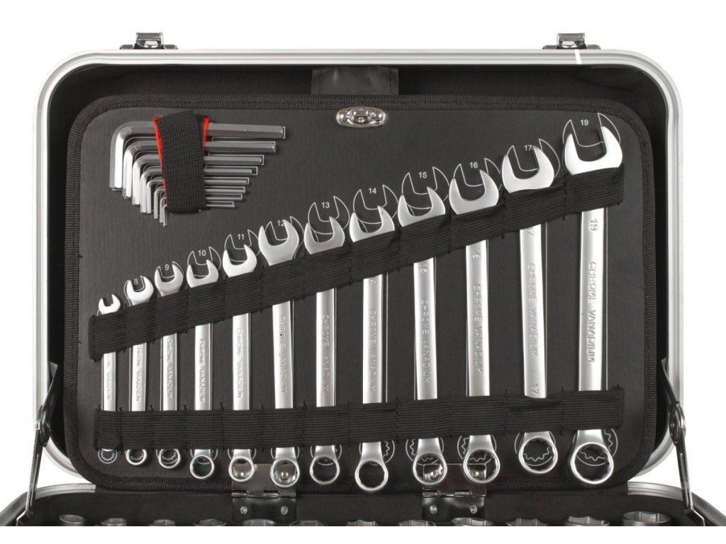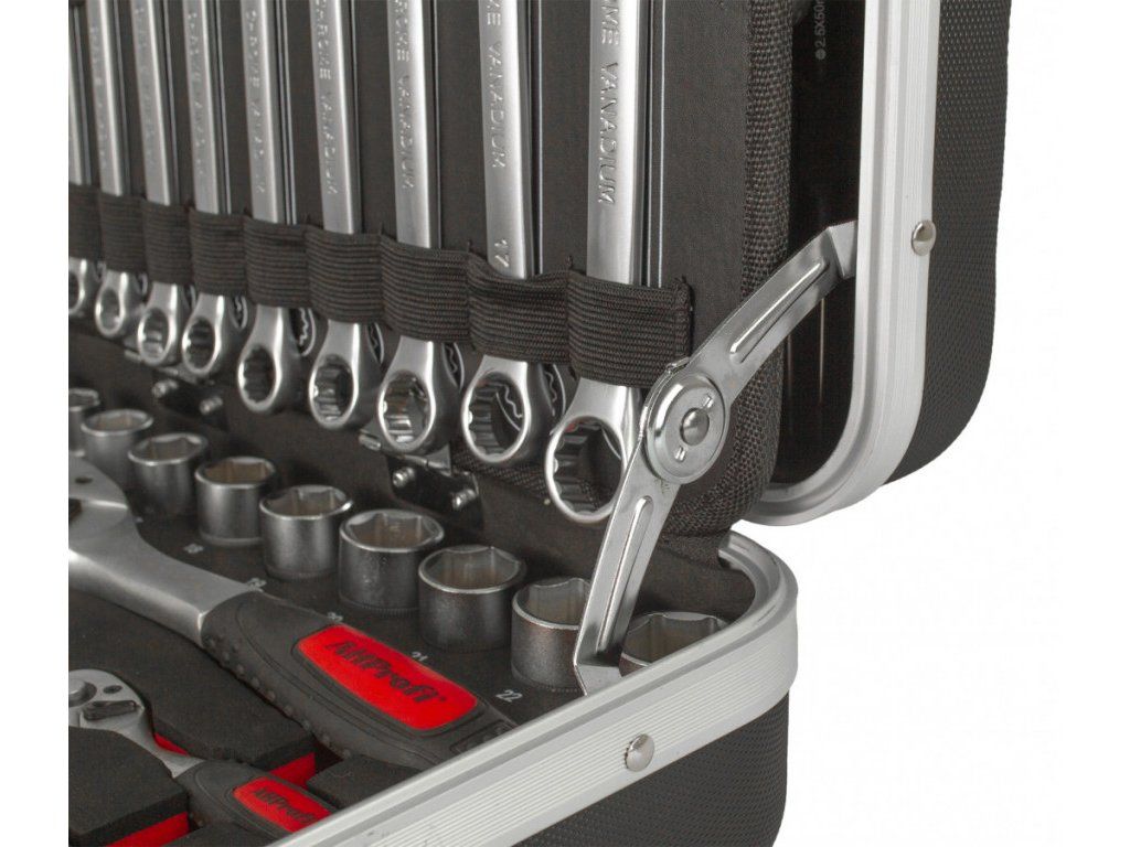 Uvnitř kufru se nachází několik sad profesionálního nářadí. Nářadí je vyrobeno ze slitiny Cr-V a jeho ergonomické rukojeti jsou příjemně pogumované, takže nekloužou, padnou do každé ruky a zajistí pohodlný úchop.