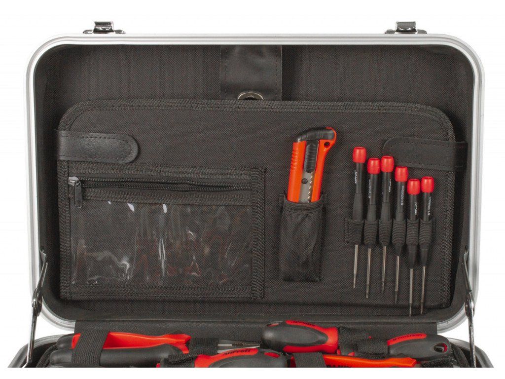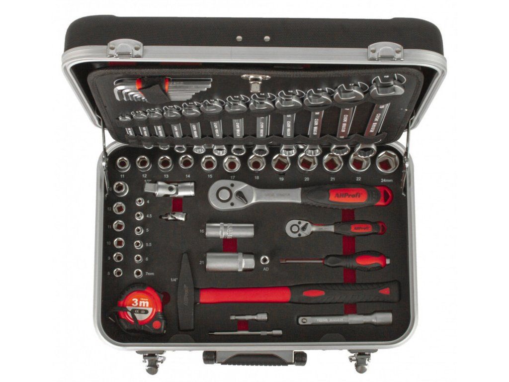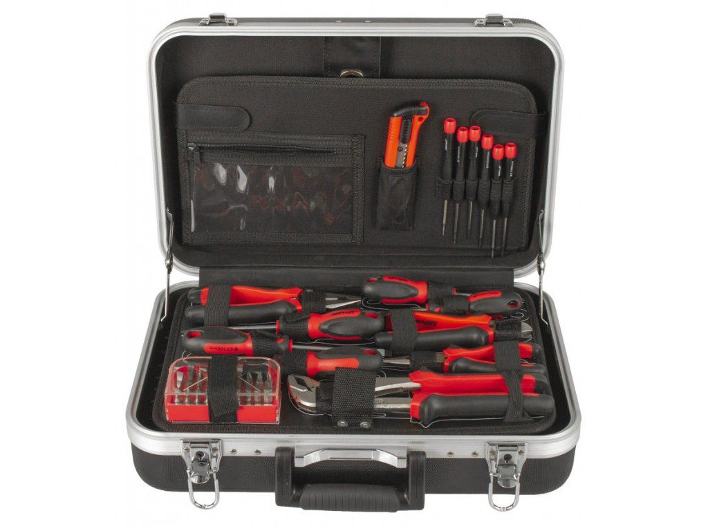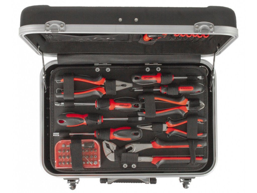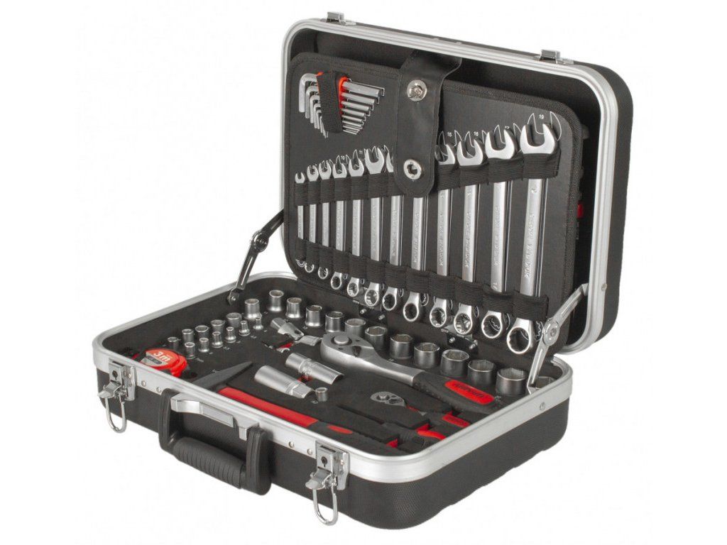 Uvnitř kufru se nachází několik sad profesionálního nářadí. Nářadí je vyrobeno ze slitiny Cr-V a jeho ergonomické rukojeti jsou příjemně pogumované, takže nekloužou, padnou do každé ruky a zajistí pohodlný úchop.