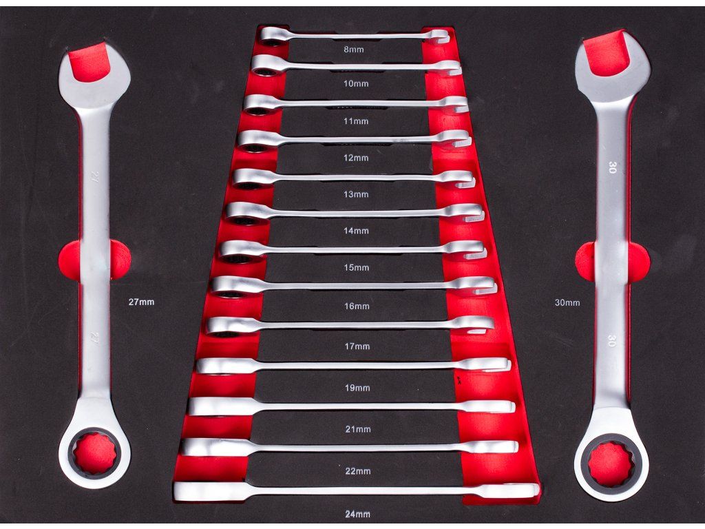 | 15 ks | Ráčnové očkoploché klíče: 6, 8, 10, 11, 12, 13, 14, 15, 16 ,17, 19, 21, 22, 24, 27 mm |