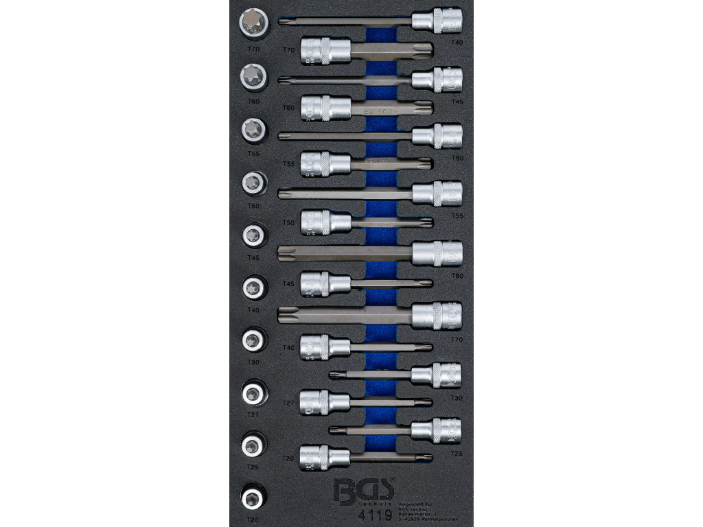 Pěnová vložka o rozměrech (š x h x v) 189 x 408 x 32 mm obsahuje celkem 26 ks nástrčných klíčů Torx o velikostech T20 - T60.