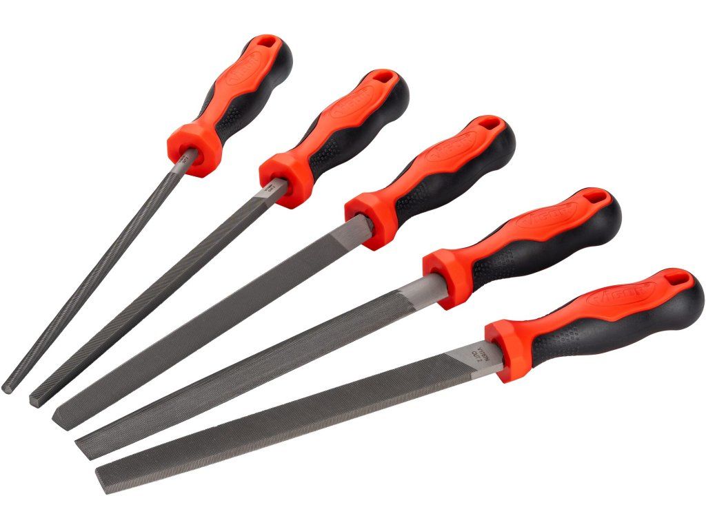 Součástí sady jsou plochý, půlkulatý, kulatý, trojúhelníkový a hranatý pilník s velikostí zubu 2 – střední, vhodné pro univerzální použití.