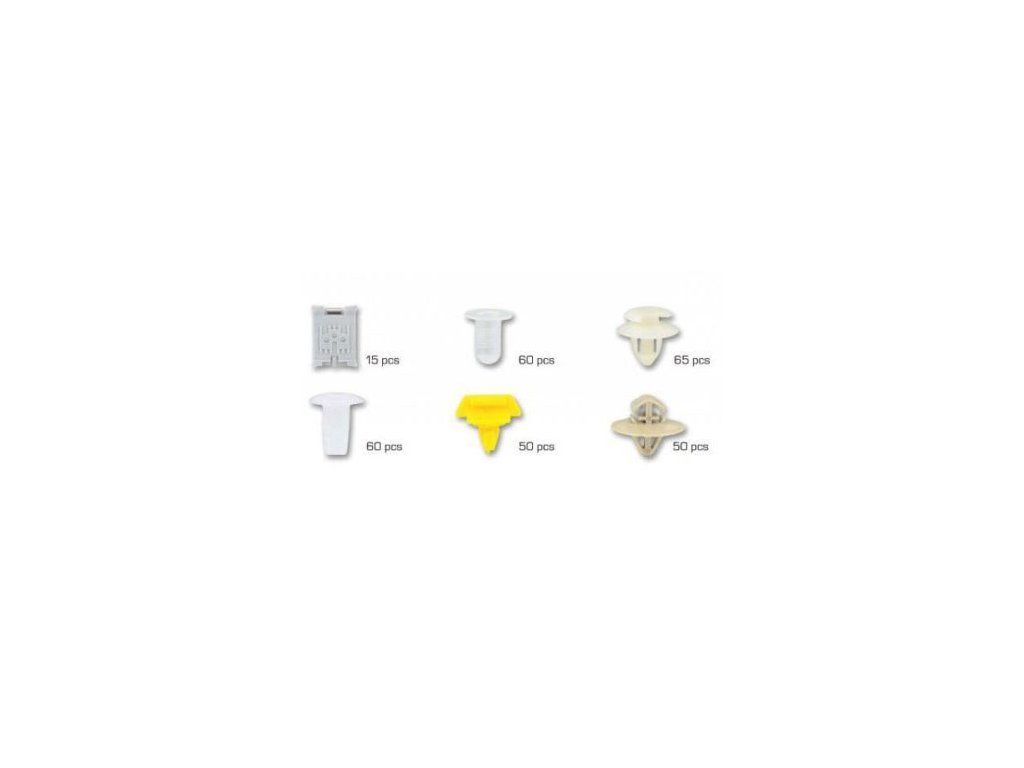 Sada nejpoužívanějších příchytek pro čalounění a plastové díly vozů Renault.