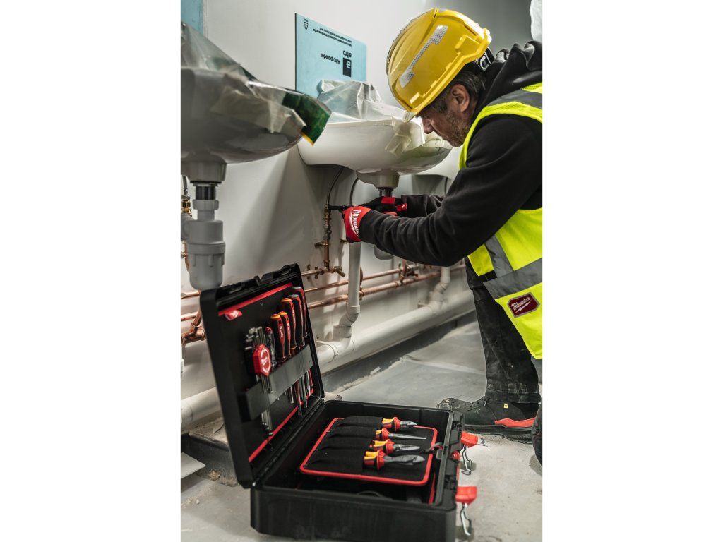 - Obsahuje - Kleště štípací VDE 160 mm, silové štípací kleště VDE 200 mm, dlouhé kleště s kulatými čelistmi VDE 205 mm, kombinované kleště VDE 180 mm, nastavitelné kleště na vodní čerpadla 250 mm, multifunkční odizolovací kleště 4v1, šroubovák Tri-Lobe VDE 0.4×2.5×75, šroubovák Tri-Lobe VDE 0.6×3.5×100, šroubovák Tri-Lobe VDE 1.2×6.5×150, sada demoličních šroubováků Tri-Lobe, zkoušečka napětí 0.5×3×65, ráčnový kombinovaný klíč MAXBITE 10 mm, ráčnový kombinovaný klíč MAXBITE 13 mm, ráčnový kombinovaný klíč MAXBITE 17 mm, ráčnový kombinovaný klíč MAXBITE 19 mm, zámečnické kladivo se sklolaminátovou násadou 300 g, sada ráčny a nástrčných klíčů 1/4" – 38 ks, nůž Fastback Flip s úložným prostorem na čepele, sada imbusových klíčů – 9 ks, sada torx klíčů ve tvaru L – 8 ks, řezačka trubek 3,2–42 mm.