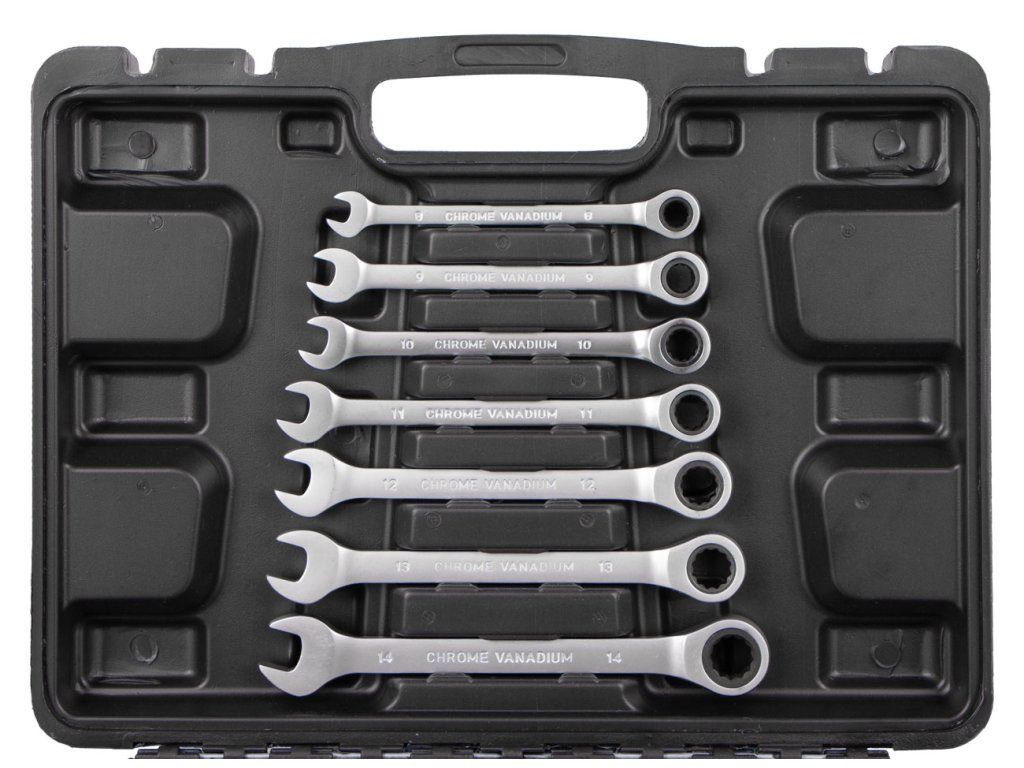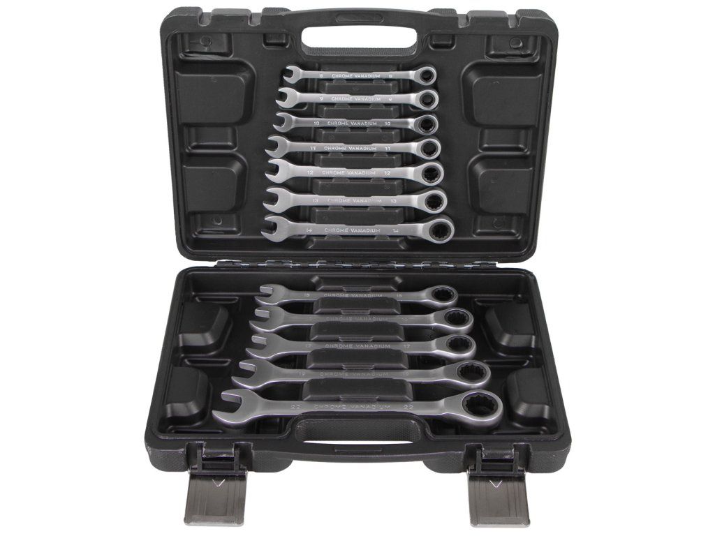 - Sada 12 ks očkoplochých ráčnových klíčů o velikosti 8, 9, 10, 11, 12, 13, 14, 15, 16, 17, 19 a 22 mm.