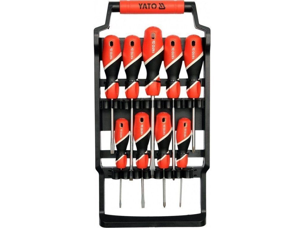 Celá sada je přehledně uložena v plastovém stojánku, který umožňuje snadné zavěšení i rychlý přístup ke každému šroubováku.