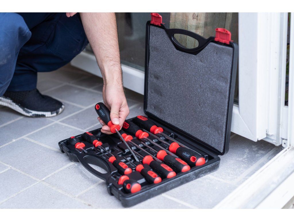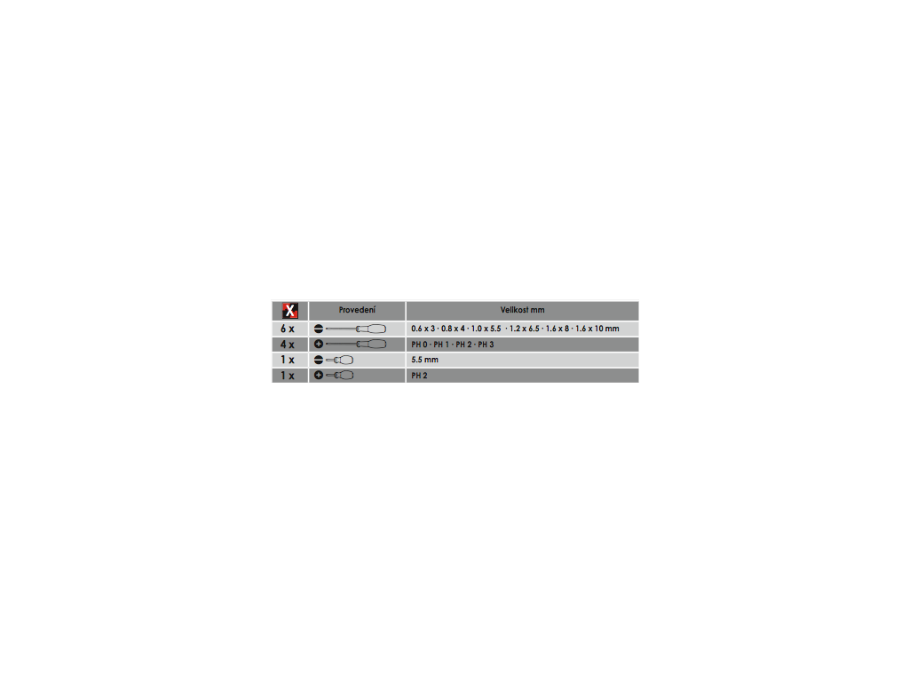 Výbavu tvoří kombinace plochých (SL) a křížových (PH / Phillips) šroubováků včetně krátkých provedení, vše přehledně uloženo v přenosném plastovém boxu.