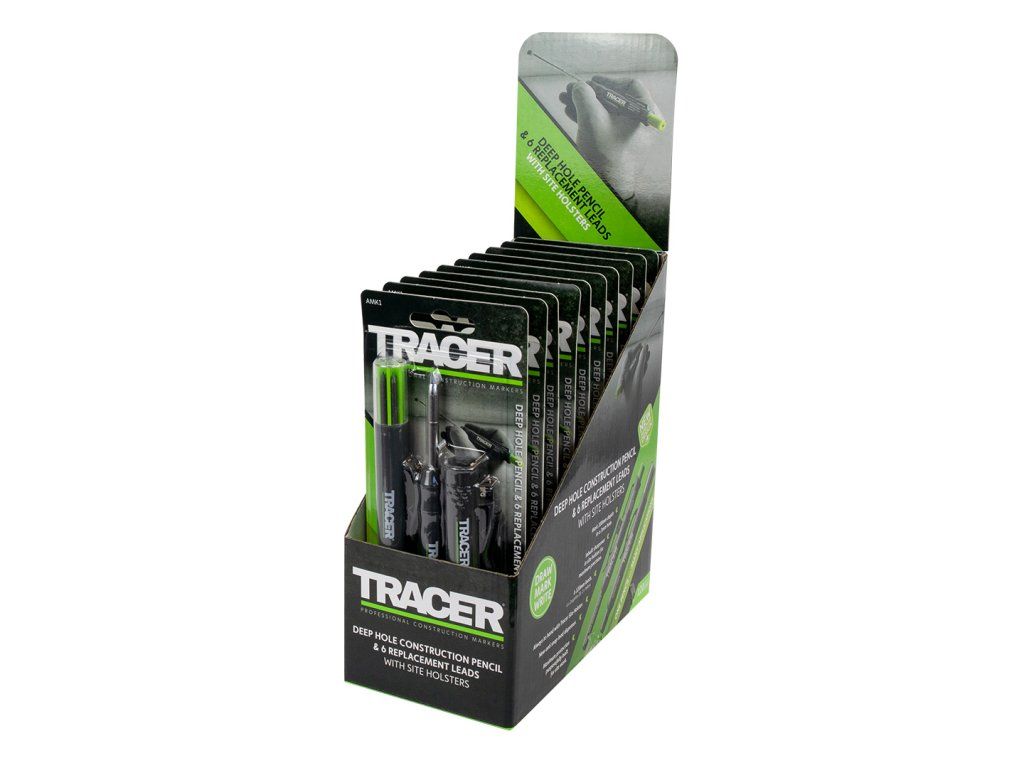 Sada všestranné truhlářské a řemeslnické tužky a vyměnitelných univerzálních náplní od britské značky Tracer. Dokáže psát na většinu povrchů. Díky výsuvným a vyměnitelným tuhám o délce 120 mm dokážete s tužkou Tracer označit jakékoliv úzké a hluboké otvory. Robustní obal ochrání vaše vyměnitelné tuhy proti zlámání. Ideální pro značení úzkých, tmavých linek. Víčko s háčkem slouží zároveň jako pouzdro, díky kterému můžete s tužkou rychle a jednoduše manipulovat.