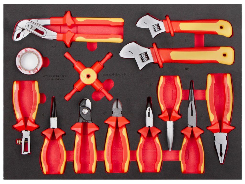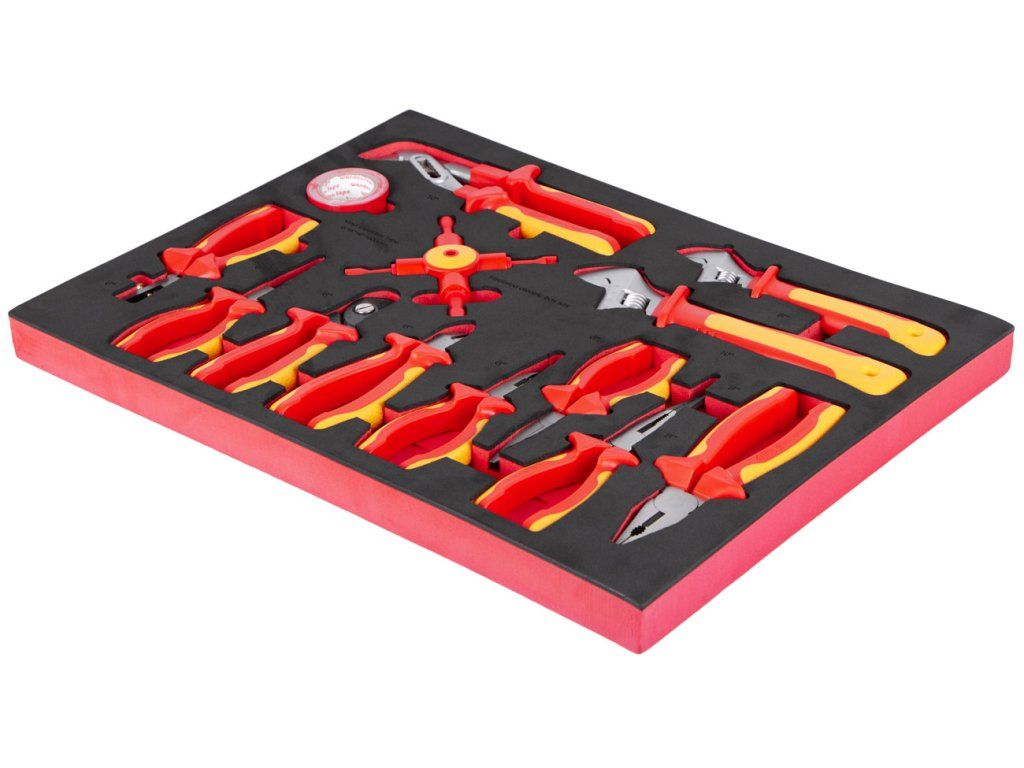 Univerzální sada izolovaného VDE nářadí pro práci s vodiči a elektrickými rozvody, uložená v praktické pěnové výplni do zásuvky dílenského vozíku.