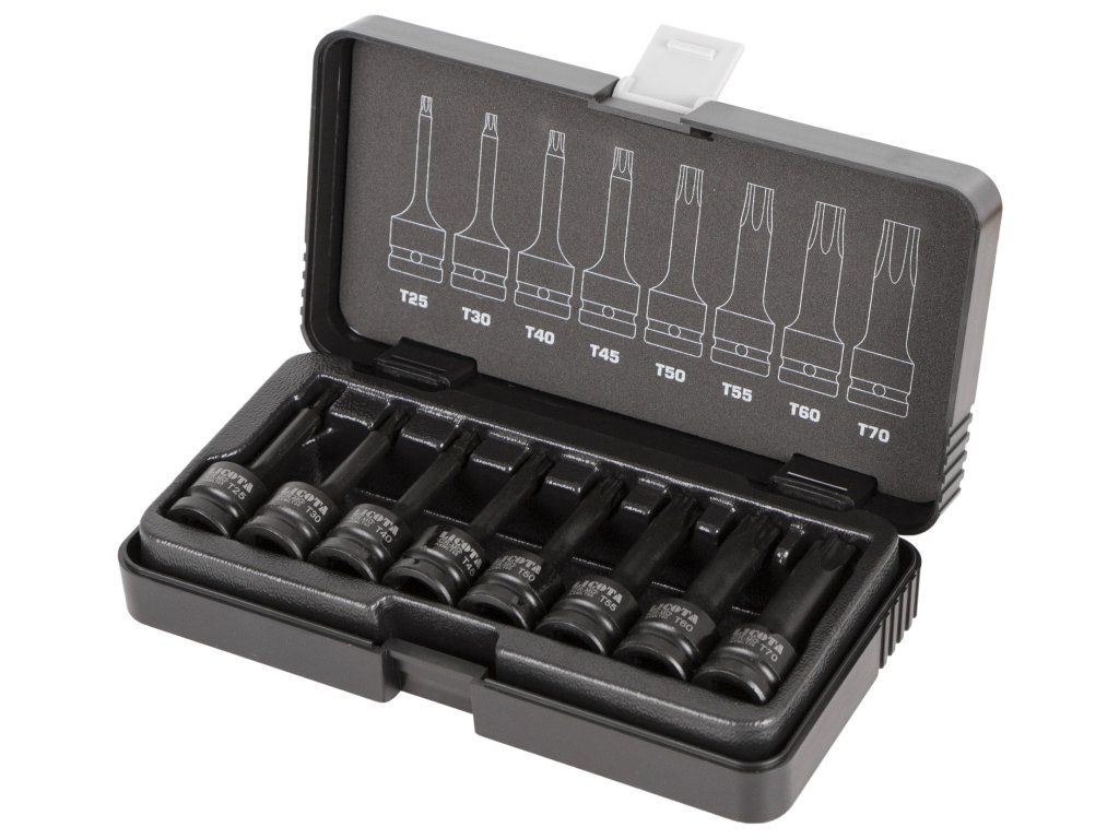 Sada vnějších nástrčných klíčů TORX 1/2" je ideální pro práci s rázovými utahováky díky své konstrukci a rozmanitým velikostem T25-T70.