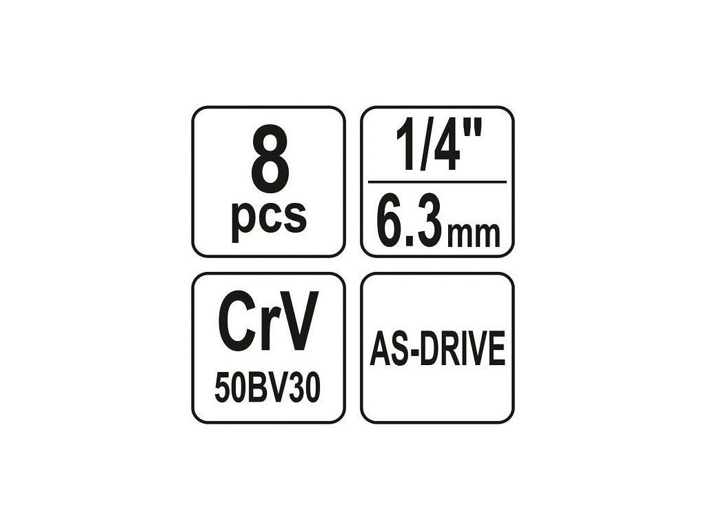 Sada vybavena systémem AS-DRIVE - vnitřní profil je tvarován do mírného obloučku. Tím při záběru hlavní síla nepůsobí přímo na hranu šroubu, ale na plochu, což významným způsobem snižuje opotřebení šroubu a pomáhá při demontáži již poškozených šroubů.