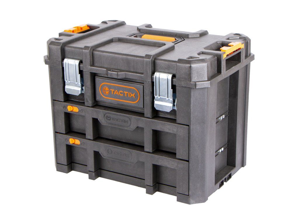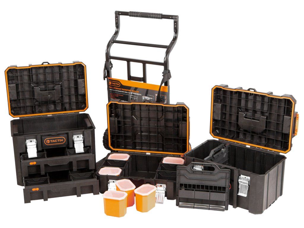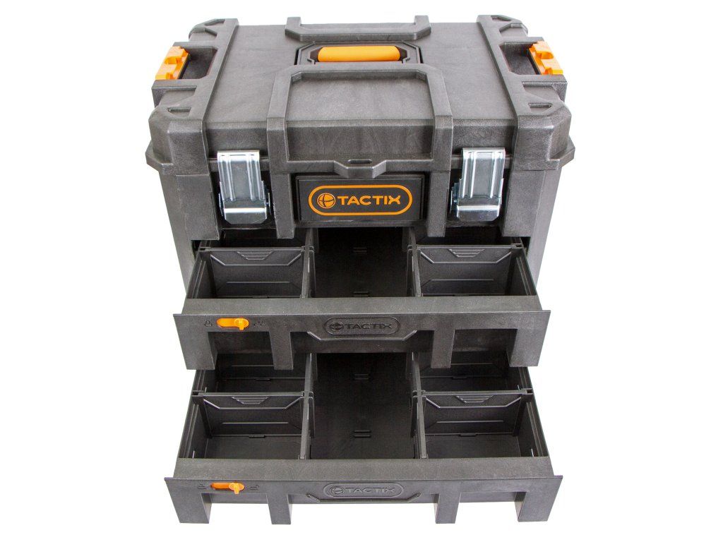 Hlavní výhodou kufrů od značky Tactix je jejich variabilita úložných prostorů, vodotěsnost a snadná manipulace celé sady díky madlu a kolečkům.