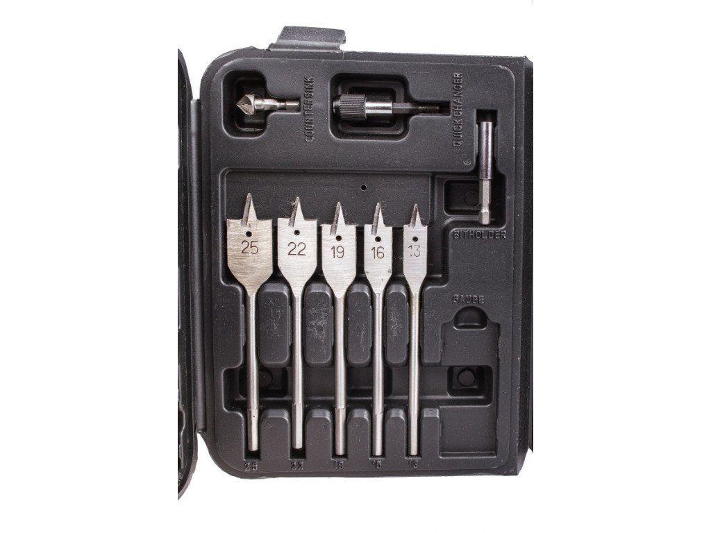 - 5 ks ploché vrtáky do dřeva: 13, 16, 19, 22, 25 mm