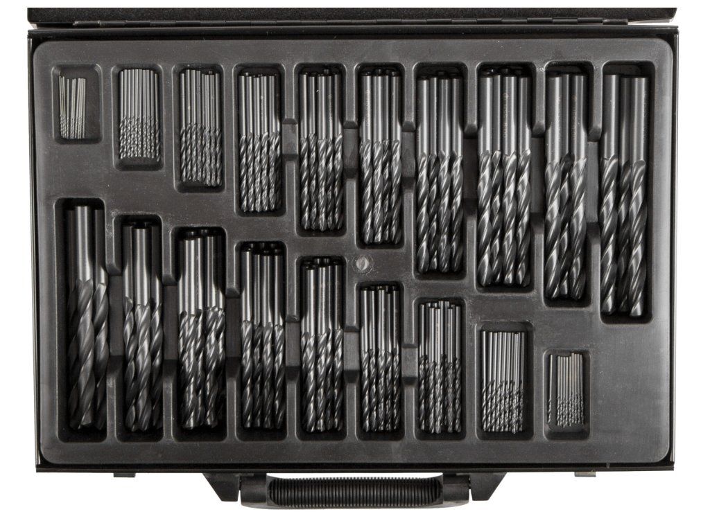 Kvalitní standardní vrtáky v sadě 170 ks odstupňovaných po 0,5 mm uložené v kovovém boxu.