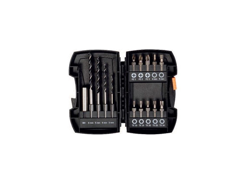 19398 Sada vrtáků s bity E 6.3 držák bitů Vrták do dřeva: průměr 3 - 4 - 5 - 6 mm Bity: PZ 1 - 2 - 3, Inbus 4 - 5 mm, T10 - 15 - 20 - 25 - 30 Magnetický držák bitů 15 dílů v kazetě z ABS Sada vrtáků s bity pro práci se dřevem Univerzální použití - Hodí se k vyvrtání i přišroubování - Přehledně uspořádané nářadí - Pevná kazeta z ABS Vrták do dřeva - Vysoká přesnost - Vystředěná špice a dvě boční ramena zajišťují vyvrtání přesného otvoru E 6.3 držák bitů - Pro rychlejší výměnu nástroje - Zvláště vhodné pro aku-vrtačky Určeno pro dřevo, měkké dřevo, dřevotřísku a překližkuDoplňkové parametry