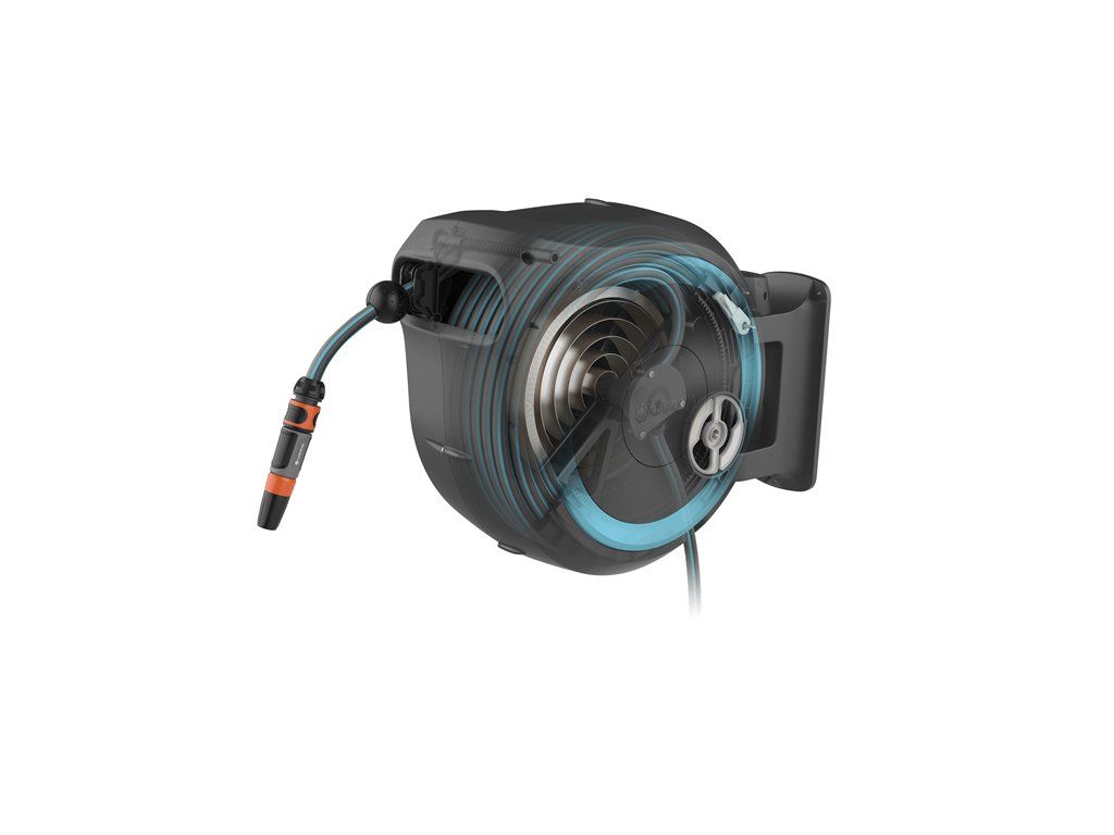 Lehkým zatažením za konec hadice se zámek uvolní a zabudovaná ocelová pružina s inovativní technologií RollControl navine plynule a kontrolovaně hadici zpět do boxu. RollControl chrání box na hadici a okolí před poškozením způsobeným příliš rychlým vtažením. Aby nedocházelo k zalomení nebo zauzlení hadice na vodu, disponuje box integrovaným vedením hadice.