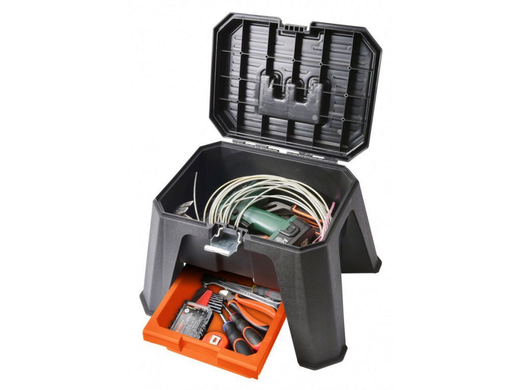 Plastové dílenské sedátko/stupátko s úložným prostorem a pevnou konstrukcí.