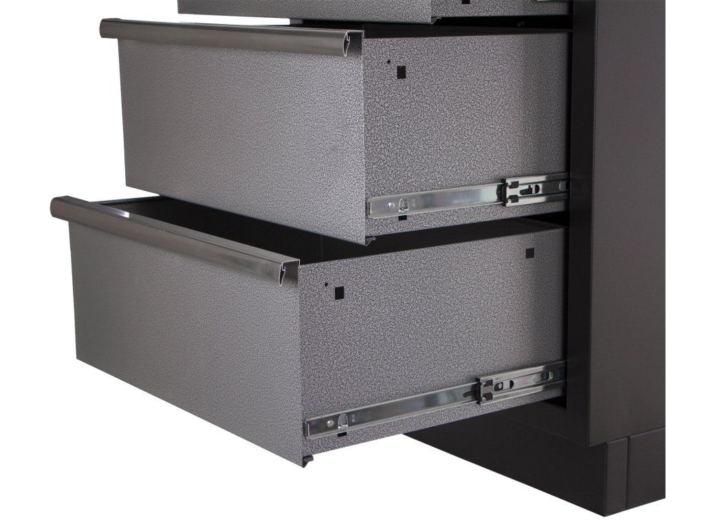 Zásuvky dílenského nábytku PROFI mají vysoce kvalitní pojezdy s kuličkovými ložisky, které poskytují plynulost a přesnost pojezdu zásuvek i při plném zatížení. Max. nosnost zásuvky činí 30 kg.