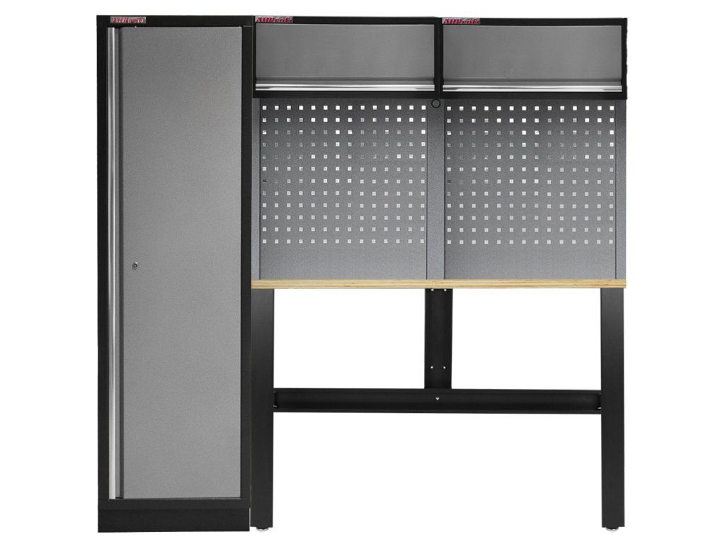 Kompaktní sestava vhodná i do menších prostor obsahuje vysokou skříň pro uskladnění různého druhu nářadí, dílenský stůl opatřen dřevěnou pracovní deskou a dvě výklopné horní skříňky.