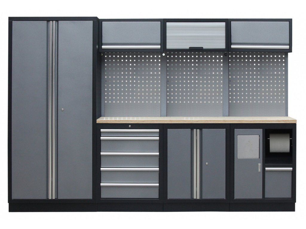 Sestava nábytku v sobě skrývá dostatečné množství úložného prostoru pro vaše nářadí, autotechniku i dílenské vybavení. V kombinaci s bytelnou pracovní deskou získáte multifunkční stěnu, se kterou vám půjde práce od ruky ve všech směrech.