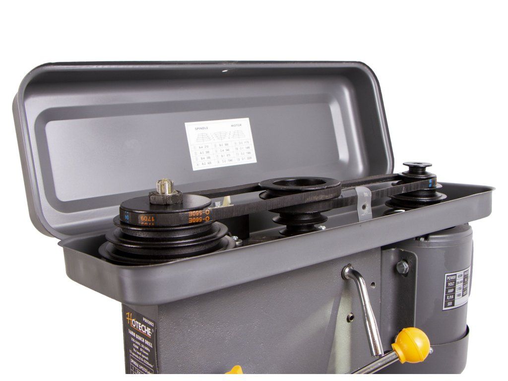 Svislý pohyb vřetena je zajištěno posuvovou pákou. Ke zvýšení bezpečnosti práce pomáhá výklopný bezpečnostní kryt sklíčidla, který Vás ochrání od možného odlítnutí špony a tím újmě na zdraví. Svislý posuv sklíčidla je možné omezit za pomoci závitové distanční hřídele s měřítkem.