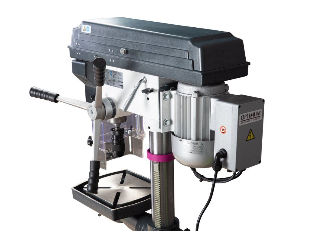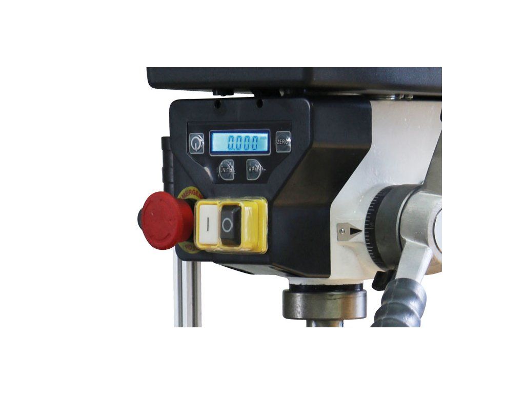 Sloupová vrtačka s řemenovým pohonem a digitálním ukazatelem otáček a vrtací hloubky na vrtací hlavě.- Výkonný motor