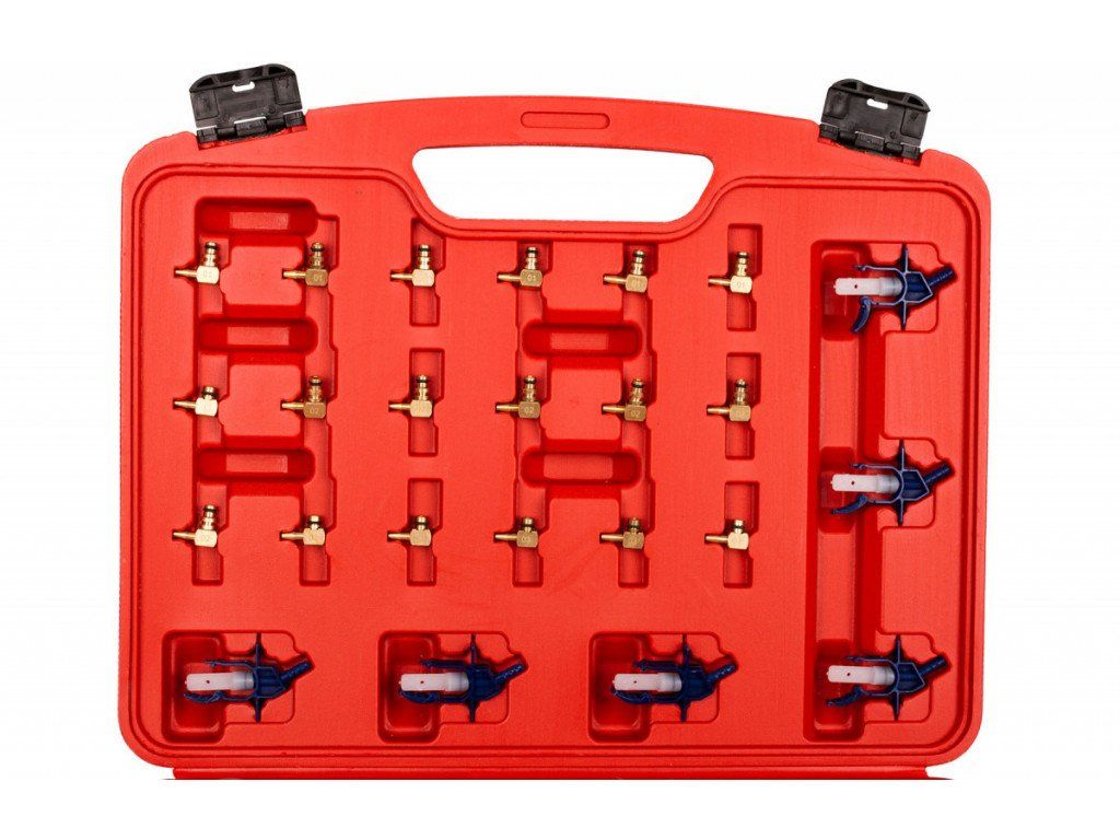 - Plastový kufřík obsahuje odměrné válce a nádoby a sortiment adaptérů pro připojení k systému Bosch, Delphi a Denso pro všechny běžně dostupné vozy.
