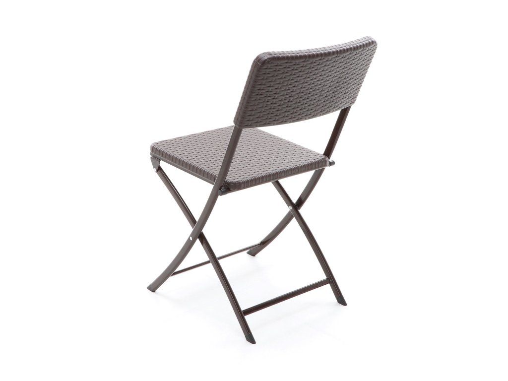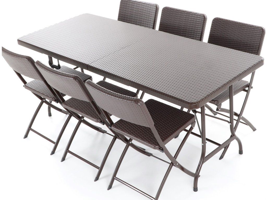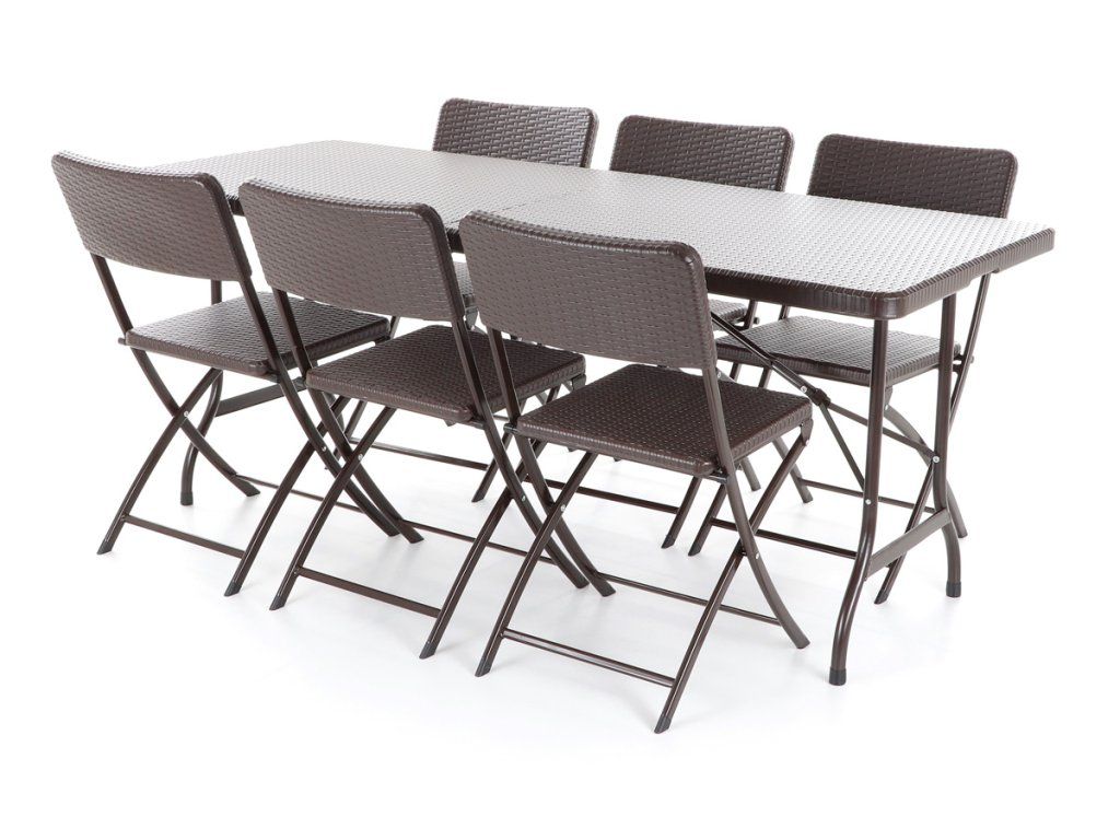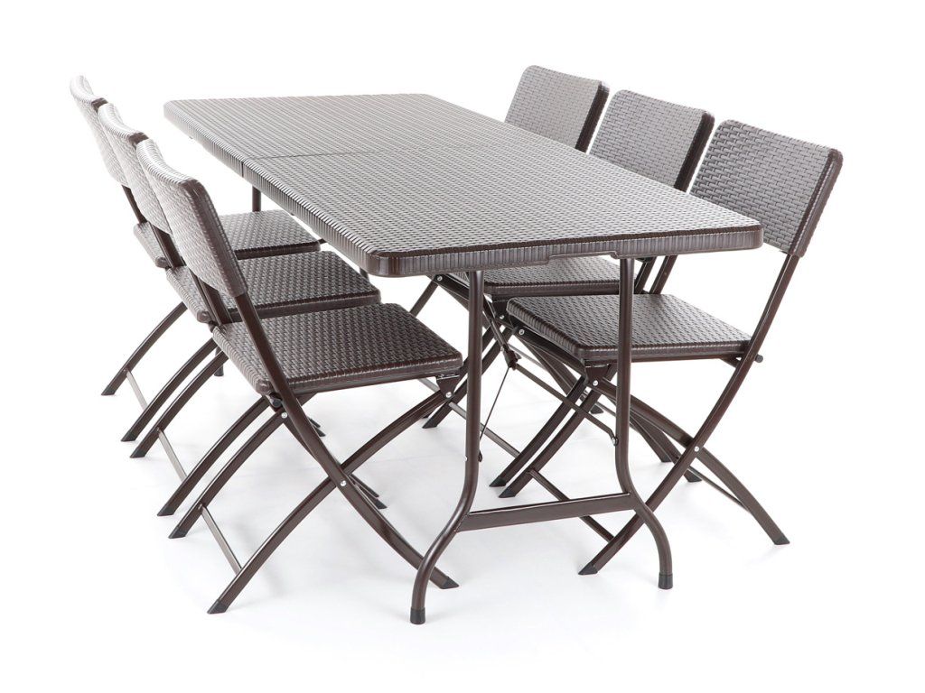 Stolová sestava 6-ti skládacích židlí z ocelových profilů povrchově dokončena komaxitovou barvou, čalounění je v imitaci umělého ratanu z lisovaného plastu s UV filtrem, určená do interiérů, exteriérů a pergolových prostor.