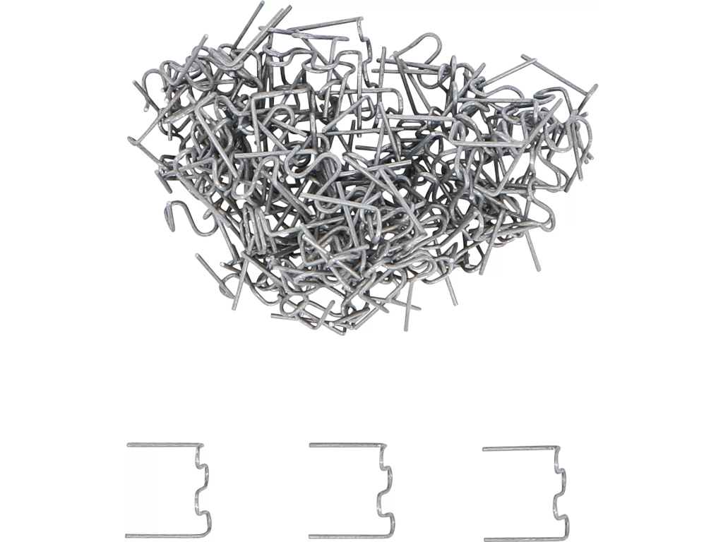 Sada 100 ks kovových sponek pro svářečky plastů určených na opravu prasklin nebo ulomených částí plastových dílů.