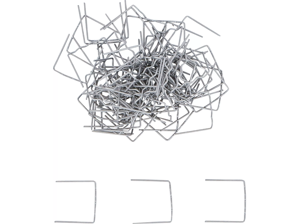 Sada 100 ks kovových sponek pro svářečky plastů určených na opravu prasklin nebo ulomených částí plastových dílů.
