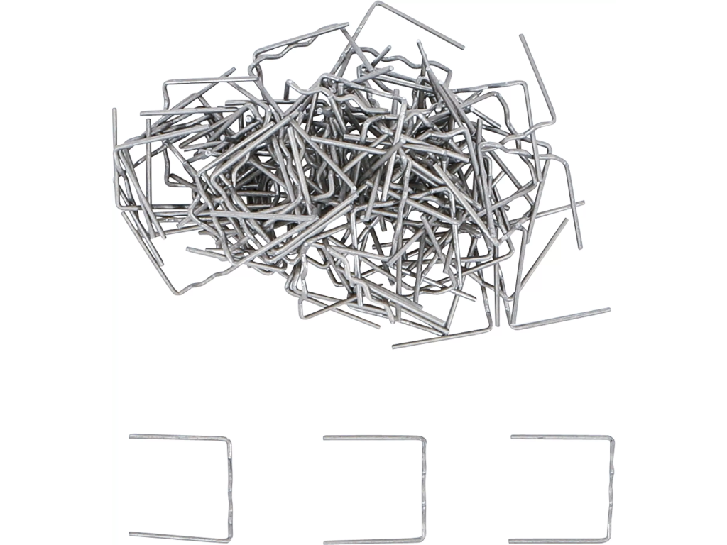 Sada 100 ks kovových sponek pro svářečky plastů určených na opravu prasklin nebo ulomených částí plastových dílů.
