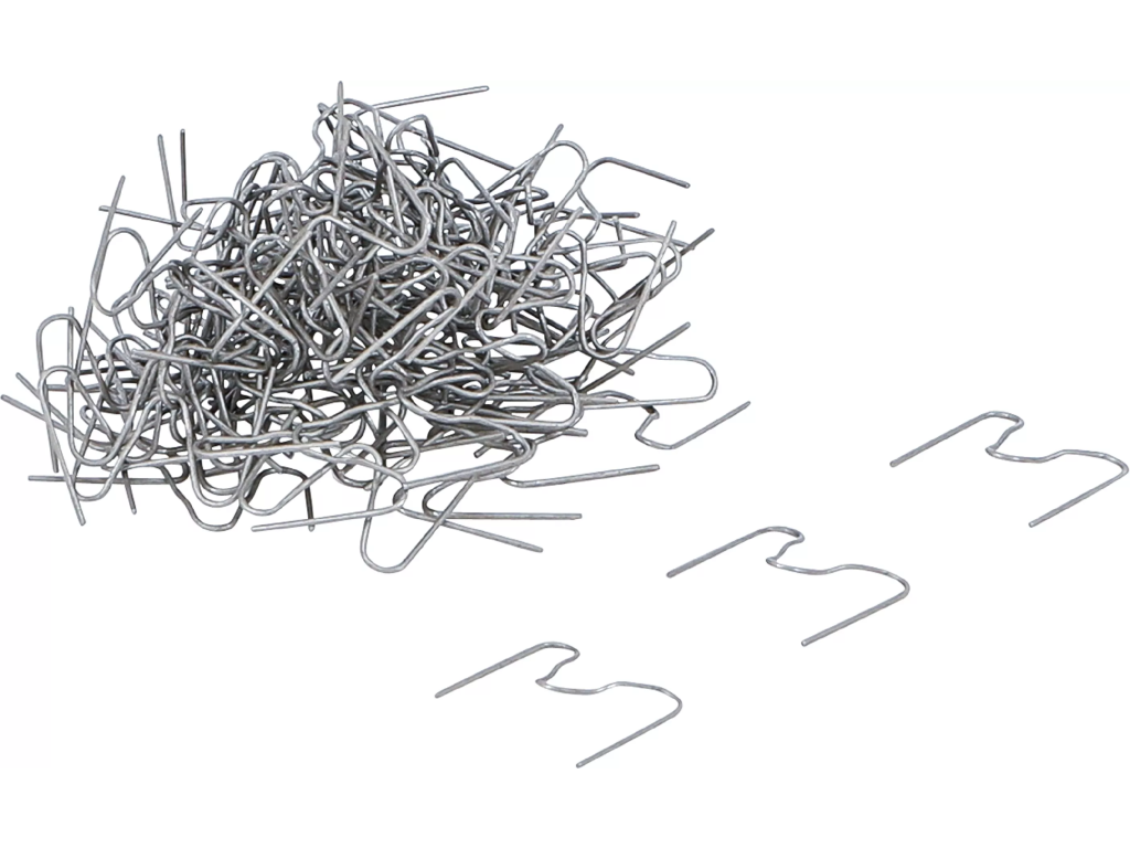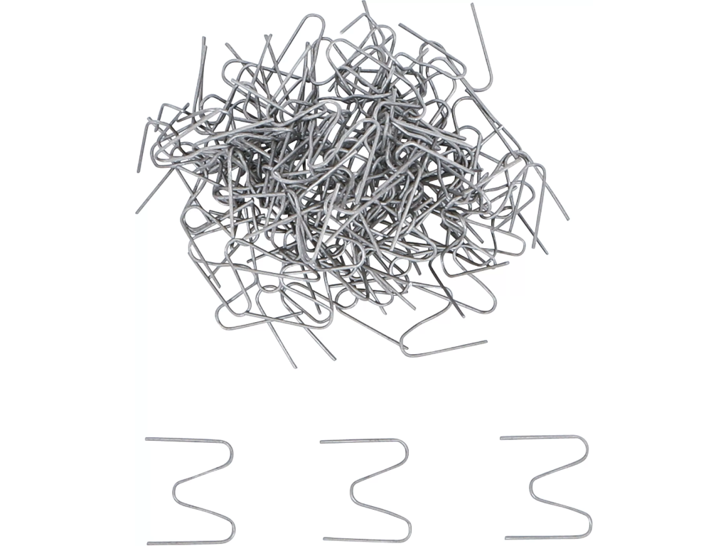Sada 100 ks kovových sponek pro svářečky plastů určených na opravu prasklin nebo ulomených částí plastových dílů.