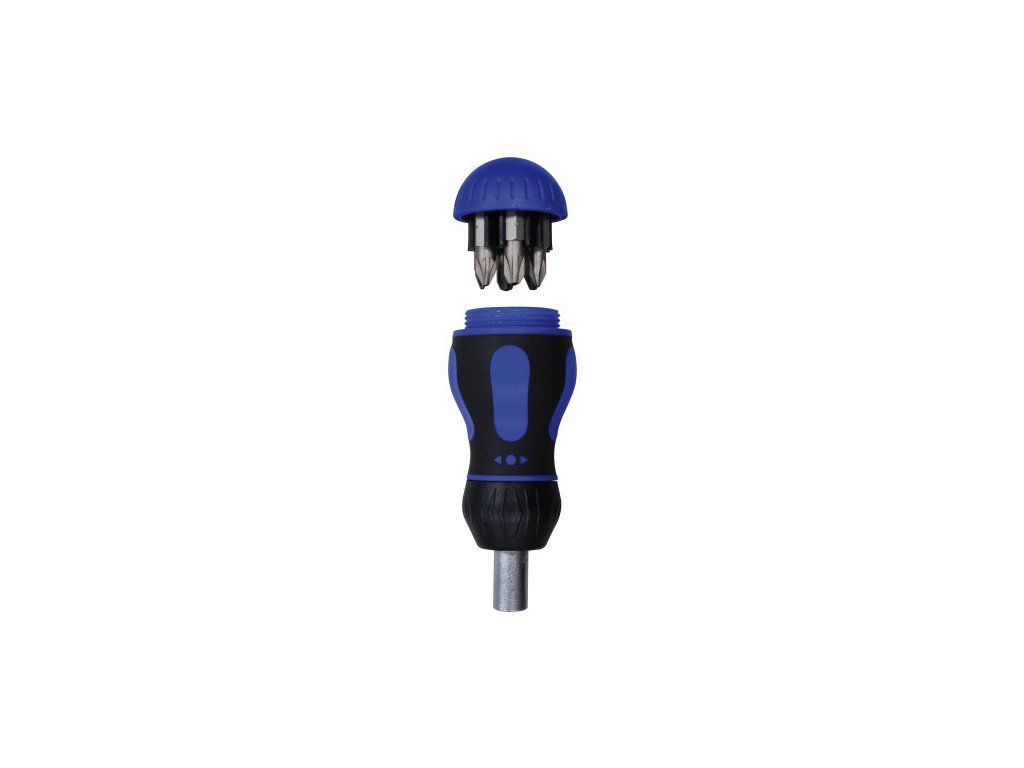 4193 1/4“ Šroubovák s ráčnovým mechanismem Stubby - Přepínatelná ráčna pravý / levý chod - Praktický, ergonomický a kompaktní - Uvnitř rukojeti se ukrývá zásobník se 6-ti bity, plus jeden v držáku - Se 1/4“ držákem bitů Obsah: 1 Ploché 5,5 mm 2 Phillips PH 1-2 2 Pozidriv PZ 1-2 2 TORX TX20-25 1 Šroubovák s ráčnovým mechanismem StubbyDoplňkové parametry