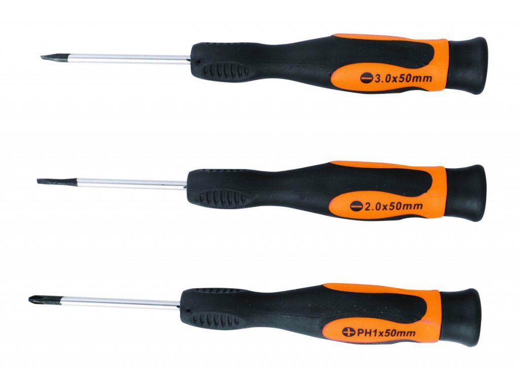Sada 3 ks precizních svidříkových šroubováků na elektroniku s plastovou pogumovanou rukojetí.