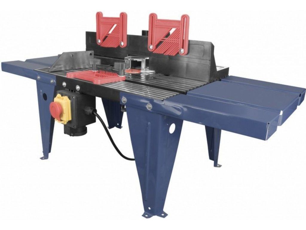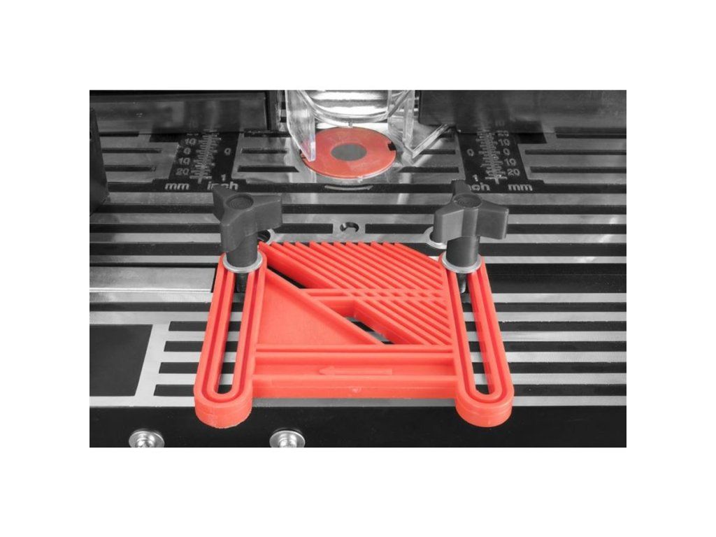 Konstrukce: hliníková pracovní deska, boční nástavce stolu (d x š: 203 x 334 mm), opěrný doraz s přípojkou odsávání, ochranný kryt břitu frézky, vodítka obrobku (3), úhlové pravítko, sada vložek stolu.