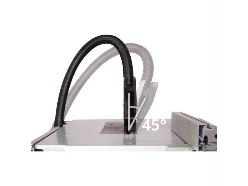 Konstrukce: stabilní ocelový rám, prodloužený pracovní stůl (→ zadní přídavný nástavec), kryt řezného kotouče s integrovaným zařízením pro odvod pilin, příčný/podélný/úhlový doraz, přípojka odsávání.