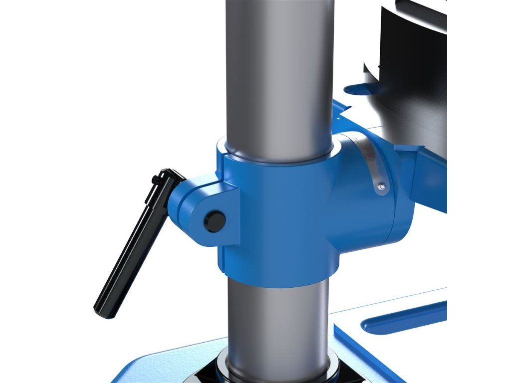 Vrtací stůl je výškově i úhlově nastavitelný (náklon ±45°, otočení o 360°) a je vybaven integrovaným svěrákem pro stabilní upnutí obrobku.