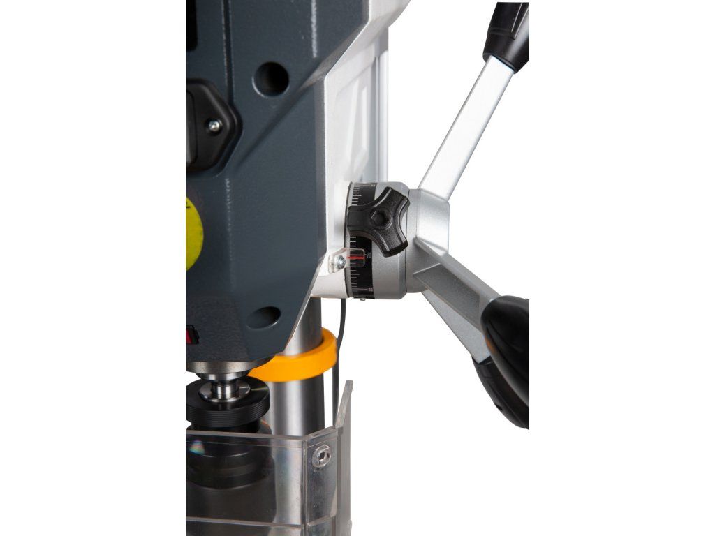 Stolní vrtačka určená pro hobby použití.- Přesně obrobený pracovní stůl s drážkami do X, je sklopný od -45° do +45° a otočný o 360°
