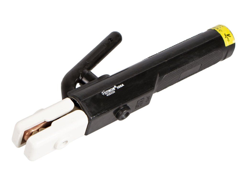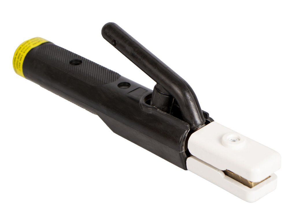 Držák elektrod je v provedení s izolovanou rukojetí a silnou pružinou pro pevné sevření elektrod. Elektroda lze do kleští upnout pod více úhly pro snadnější manipulovatelnost.